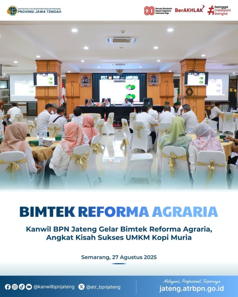 Semarang – Kanwil BPN Provinsi Jawa Tengah menggelar Bimbingan Teknis (Bimtek) Pemberdayaan Tanah Masyarakat yang berlangsung di Aula Sentosa Kanwil BPN Jateng secara hybrid baik diikuti secara langsung maupun lewat Zoom (27/8/2025).