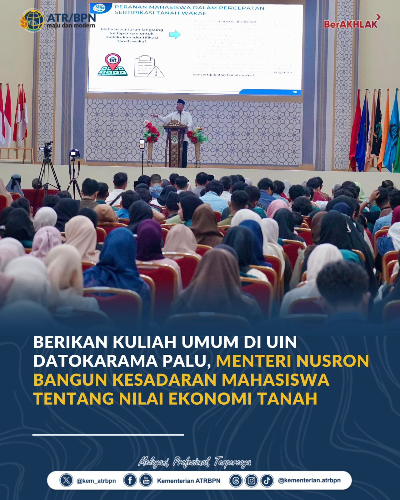 “Banyak orang memiliki tanah, tetapi belum bersertipikat sehingga tidak memiliki nilai ekonomi. Maka lahirlah program PRONA yang dilanjutkan menjadi PTSL (Pendaftaran Tanah Sistematis Lengkap),” ujar Menteri ATR/Kepala BPN saat memberikan Kuliah Umum di Auditorium UIN Datokarama Palu, Sulawesi Tengah, Rabu (01/04/2026).