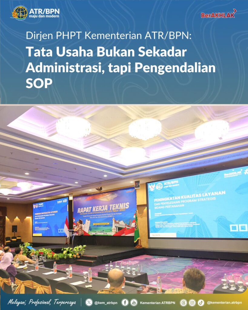Yogyakarta – Direktur Jenderal Penetapan Hak dan Pendaftaran Tanah (PHPT) Kementerian Agraria dan Tata Ruang/Badan Pertanahan Nasional (ATR/BPN), Asnaedi, menyoroti fungsi tata usaha dalam menjaga konsistensi pelaksanaan standar operasional prosedur (SOP) layanan pertanahan. Peran itu ia katakan sebagai bagian dari upaya Kementerian ATR/BPN memperkuat pengendalian internal dan mendorong perbaikan tata kelola pelayanan.