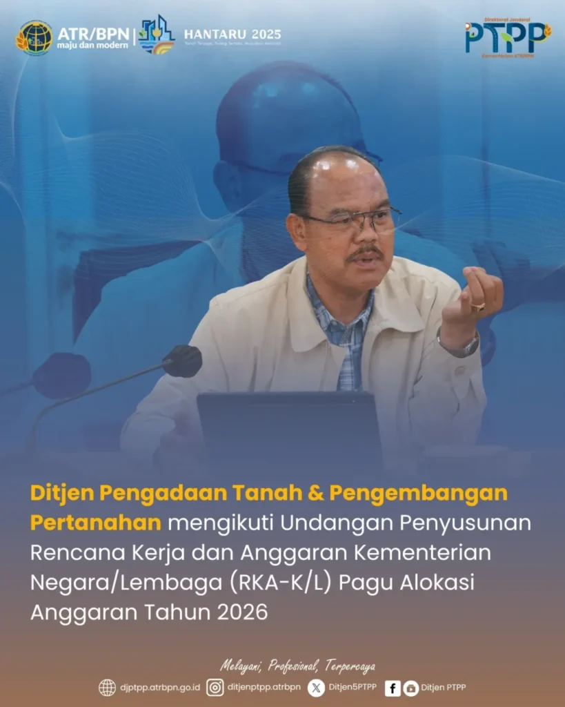 Jakarta, 3 Oktober 2025 – Direktorat Jenderal Pengadaan Tanah dan Pengembangan Pertanahan (Ditjen PTPP) melalui Sekretariat Direktorat Jenderal Pengadaan Tanah dan Pengembangan Pertanahan mengikuti Undangan Penyusunan Rencana Kerja dan Anggaran (RKA-K/L) Pagu Alokasi Anggaran Tahun 2026 Kementerian Agraria dan Tata Ruang/Badan Pertanahan Nasional hari ke-2 yang diselenggarakan secara daring oleh Biro Perencanaan dan Kerja Sama, Sekretariat Jenderal.