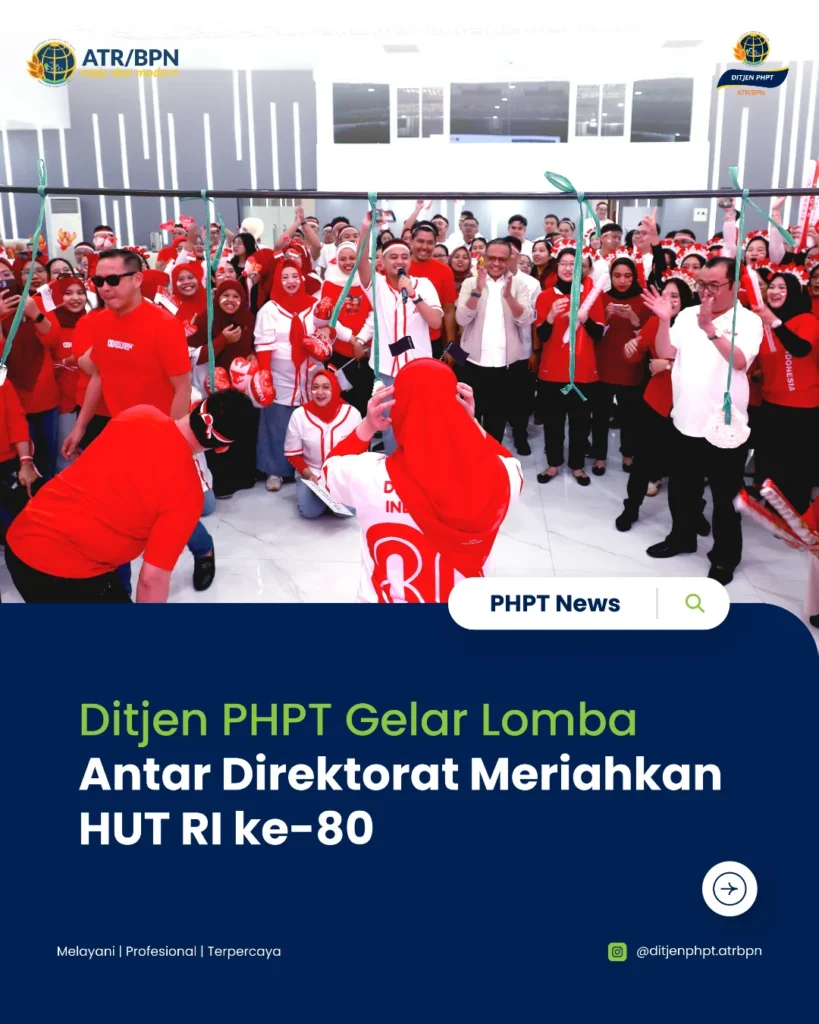 Dalam rangka memperingati Hari Ulang Tahun Kemerdekaan Republik Indonesia ke-80, Direktorat Jenderal Penetapan Hak dan Pendaftaran Tanah (Ditjen PHPT) menggelar lomba antar direktorat pada Selasa (19/08/2025) di Aula Prona, Kementerian Agraria dan Tata Ruang/Badan Pertanahan Nasional.