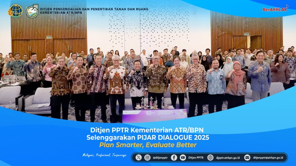 Jakarta – Direktorat Jenderal Pengendalian dan Penertiban Tanah dan Ruang (Ditjen PPTR), Kementerian Agraria dan Tata Ruang/Badan Pertanahan Nasional (ATR/BPN) menyelenggarakan PIJAR DIALOGUE 2025 dengan tema “Penilaian Perwujudan Rencana Tata Ruang Menuju Tata Ruang yang Semakin Berkualitas” secara hybrid di Jakarta pada Kamis, (28/8/2025). Acara dibuka oleh Direktur Jenderal PPTR, Jonahar, dan dihadiri oleh Direktur Jenderal Tata Ruang, Suyus Windayana, yang mewakili Menteri ATR/Kepala BPN; Sekretaris Direktorat Jenderal Tata Ruang, Reny Windyawati; Asisten Deputi Penyelenggaraan Tata Ruang dan Penataan Ruang, Djuang Fadjar Sodikin; Kasubdit Pertanahan dan Penataan Ruang Kementerian Dalam Negeri, Benny Kamil; Kepala Dinas Pekerjaan Umum dan Penataan Ruang Kabupaten Morowali, Fitraudin Bada; Plt. Kepala Dinas Pertanahan dan Tata Ruang Kabupaten Sleman, Rin Andrijani; Kepala Kantor Wilayah Badan Pertanahan Nasional Provinsi Daerah Khusus Jakarta, Alen Saputra; perwakilan asosiasi; perwakilan akademisi dan pakar bidang tata ruang dari Institut Teknologi Bandung (ITB), Sugiyantoro sebagai narasumber. Sebanyak 14 Kementerian/Lembaga, 40 Organisasi Perangkat Daerah (OPD) Provinsi/Kabupaten/Kota dari berbagai wilayah Indonesia turut hadir langsung, sementara Kantor Wilayah Badan Pertanahan Nasional dan Kantor Pertanahan di seluruh wilayah Indonesia mengikuti acara ini secara online.