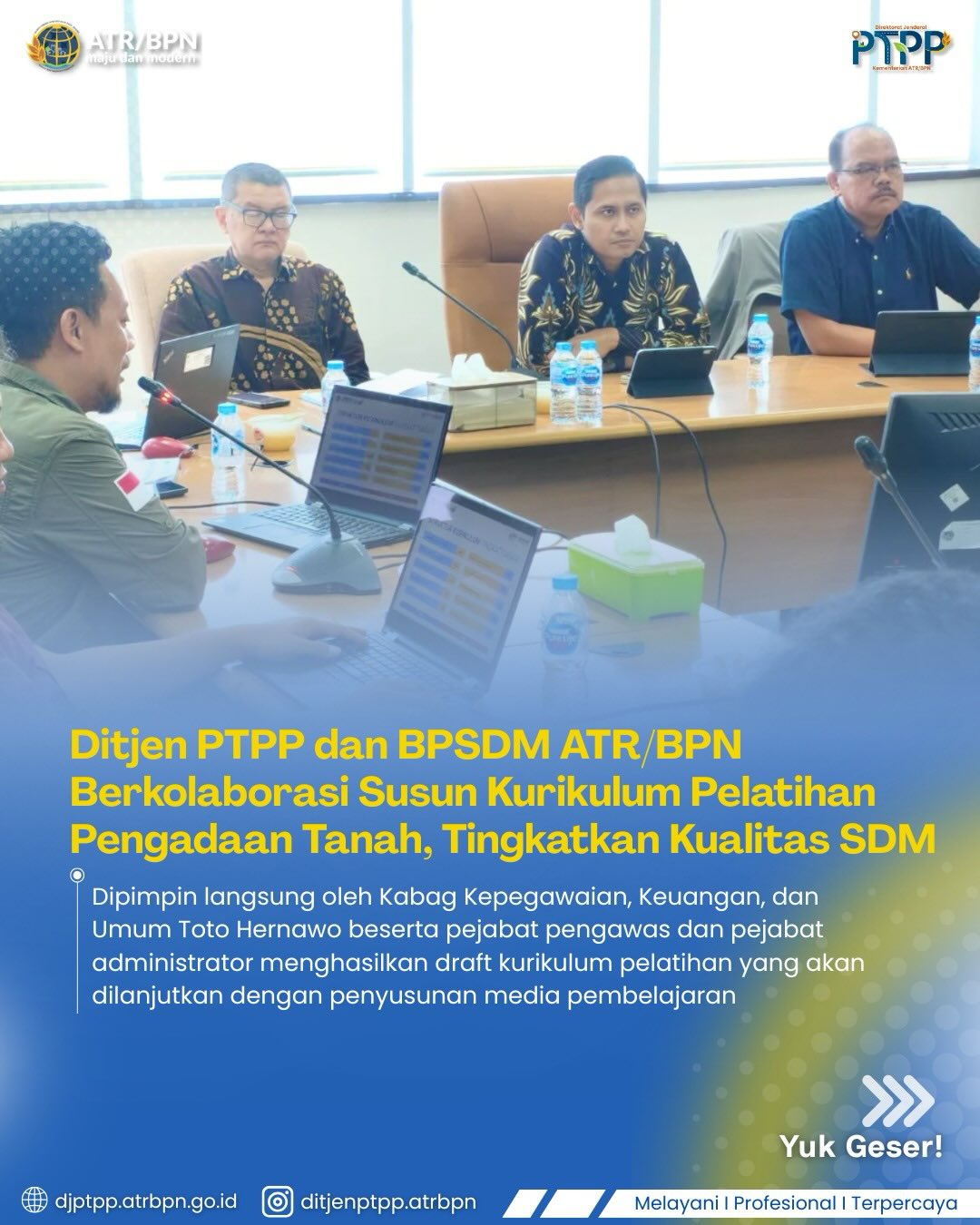 Rapat melibatkan Sekretaris Direktorat Jenderal, dihadiri oleh Toto Hernawo, Kepala Bagian Kepegawaian, Keuangan dan Umum dan Siyamto, Kepala Bagian Program dan Hukum, Direktorat Bina Pengadaan dan Pencadangan Tanah, hingga jajaran Kepala Subdirektorat. Kolaborasi ini memastikan bahwa modul yang disusun tidak hanya kuat secara teori, namun juga relevan dengan tantangan operasional yang dihadapi oleh Direktorat Jenderal terkait.