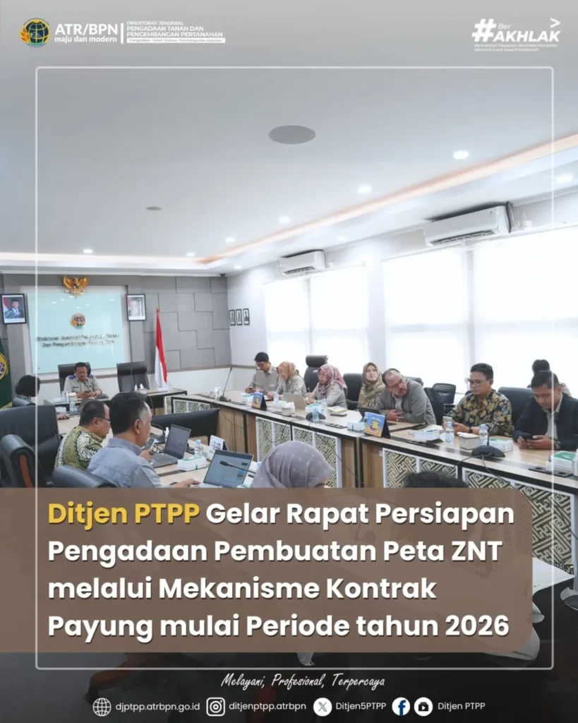 Jakarta, 25 Agustus 2025 – Direktorat Jenderal Pengadaan Tanah dan Pengembangan Pertanahan (Ditjen PTPP) menggelar rapat persiapan pelaksanaan kontrak payung untuk pembuatan Peta Zona Nilai Tanah (ZNT) Tahun 2026.