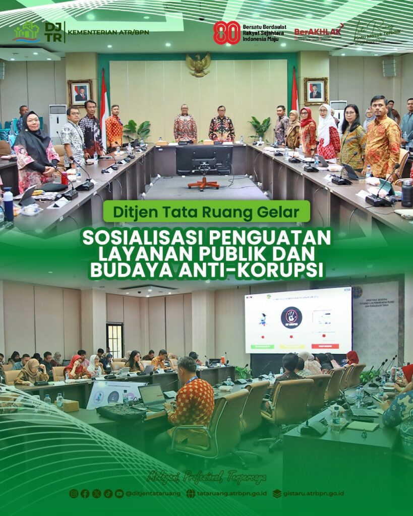 Jakarta – Dalam rangka memperkuat penerapan manajemen risiko, menegakkan prinsip transparansi, serta membangun sistem pelayanan publik yang akuntabel, Direktorat Jenderal Tata Ruang menggelar Sosialiasasi Penguatan Layanan Publik dan Penyelenggaraan Penataan Ruang yang Berintegrasi Menuju Terwujudnya Budaya Anti-Korupsi dan Gratifikasi pada Jumat (15/08).
