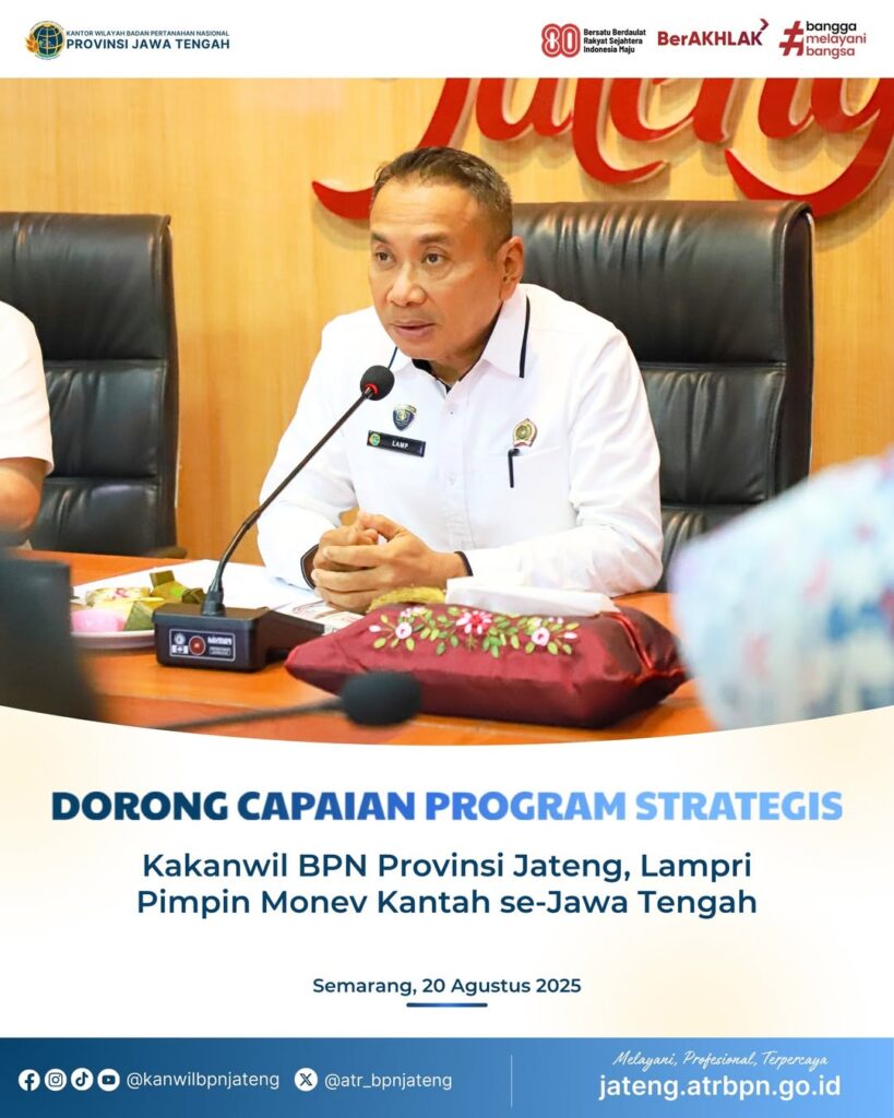 Semarang – Kepala Kantor Wilayah Badan Pertanahan Nasional (BPN) Provinsi Jawa Tengah, Lampri, memimpin langsung kegiatan Monitoring dan Evaluasi (Monev) capaian kinerja Kantor Pertanahan se-Jawa Tengah yang dilaksanakan pada Rabu (20/8/2025). Kegiatan ini bertujuan untuk mengoptimalkan capaian program strategis, mengidentifikasi kendala lapangan, serta merumuskan solusi konkret yang dapat segera ditindaklanjuti.