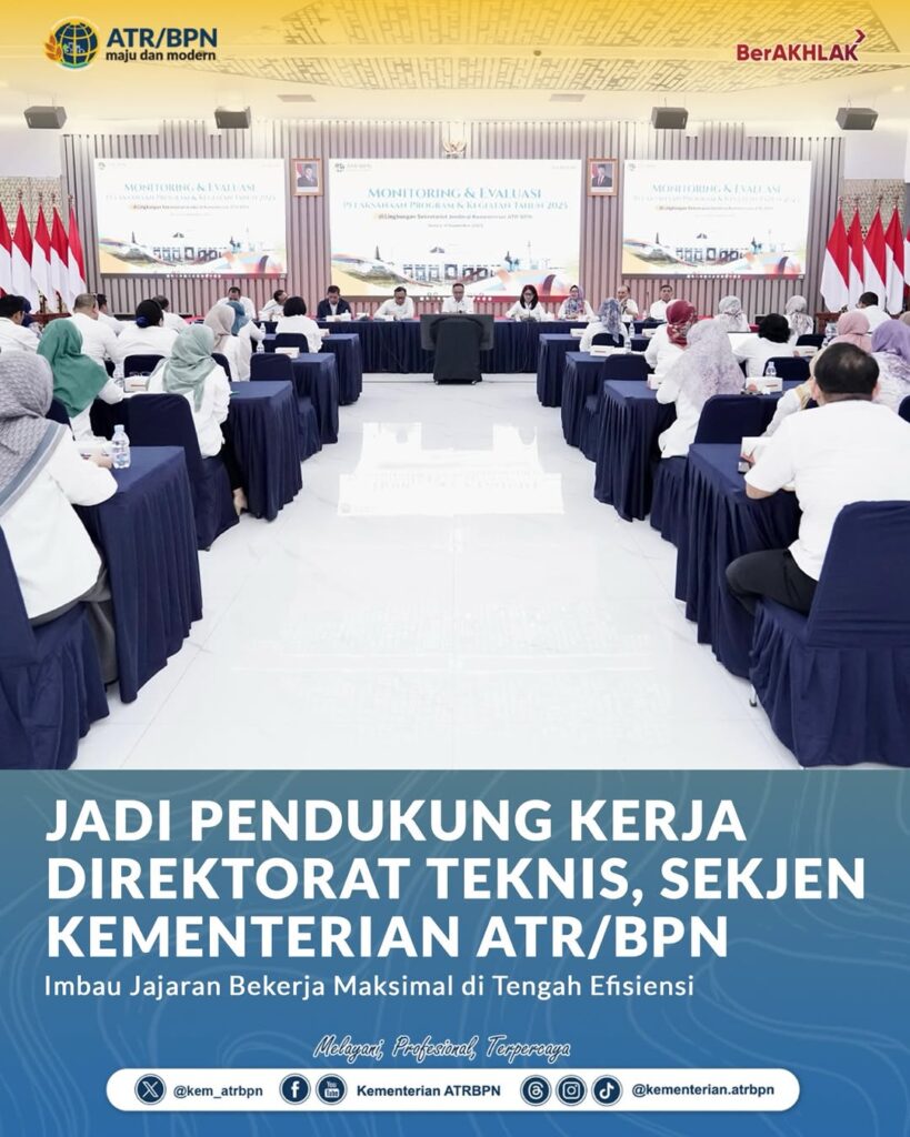Jakarta – Peran Sekretariat Jenderal menjadi pendukung jalannya program Kementerian Agraria dan Tata Ruang/Badan Pertanahan Nasional (ATR/BPN). Demikian kata Sekretaris Jenderal (Sekjen) Kementerian ATR/BPN, Pudji Prasetijanto Hadi, saat memimpin Monitoring dan Evaluasi (Monev) Pelaksanaan Program dan Kegiatan Tahun 2025 di lingkungan Sekretariat Jenderal, di Aula Prona Kementerian ATR/BPN, Jakarta, Selasa (09/09/2025).
