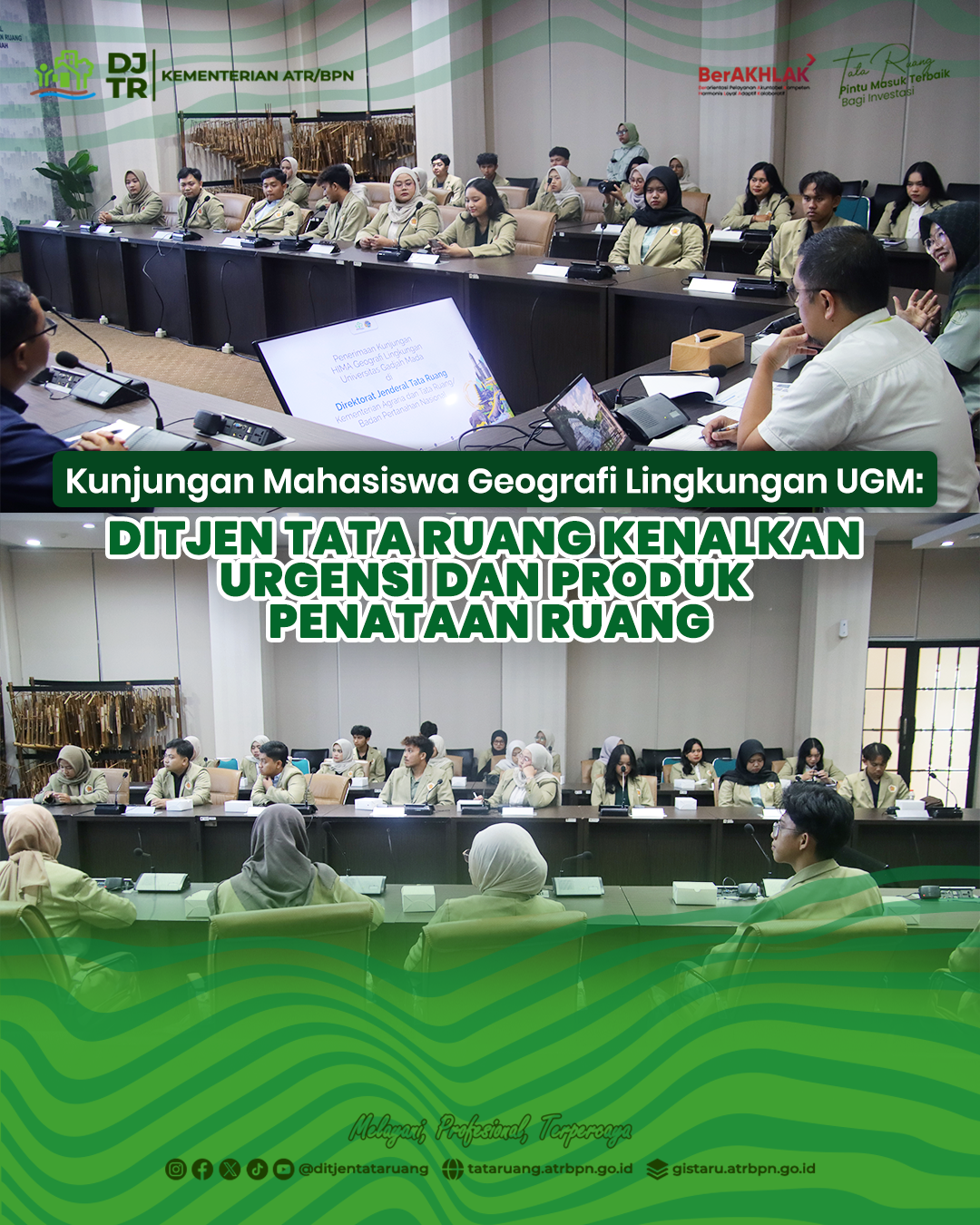 Mahasiswa lantas diajak untuk mengenali urgensi penataan ruang di Indonesia; tugas dan fungsi DJTR; penyelenggaraan penataan ruang; serta relevansinya keilmuan geografi.