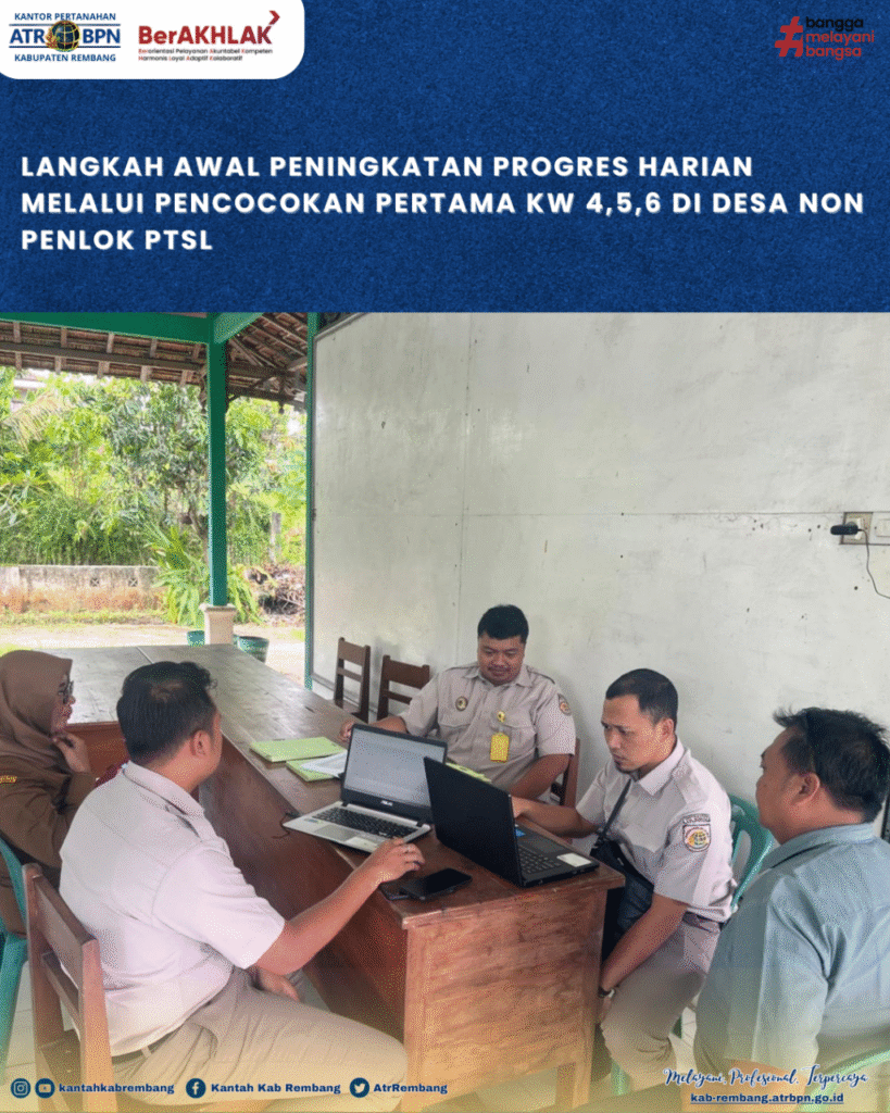 Rembang – Dalam rangka mendukung percepatan pelaksanaan Pendaftaran Tanah Sistematis Lengkap (PTSL) Tahun 2026, Tim PTSL Kantor Pertanahan Kabupaten Rembang melaksanakan kegiatan pencocokan pertama berkas Kategori Wilayah (KW) 4, 5, dan 6 di desa non penlok PTSL. Kegiatan ini merupakan langkah awal strategis untuk meningkatkan progres harian serta memastikan ketertiban administrasi dalam pelaksanaan PTSL.
