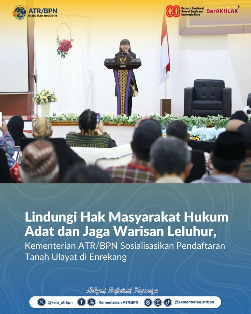 Enrekang – Kementerian Agraria dan Tata Ruang/Badan Pertanahan Nasional (ATR/BPN) menggelar Sosialisasi Pengadministrasian dan Pendaftaran Tanah Ulayat Provinsi Sulawesi Selatan, di Aula Kantor Bupati Enrekang, Kamis (28/08/2025). Dalam sambutannya, Staf Khusus Bidang Reforma Agraria, Rezka Oktoberia, menyebut sosialisasi ini jadi upaya kementerian melindungi hak masyarakat hukum adat dan menjaga tanah warisan leluhur agar tidak hilang ditelan zaman.