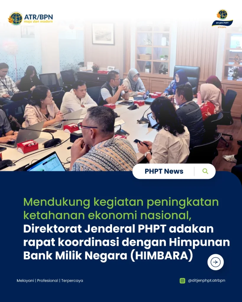 Sebagai bentuk dukungan terhadap upaya Pemerintah untuk meningkatkan ketahanan ekonomi nasional melalui pemberdayaan usaha mikro, kecil, dan menengah berupa kemudahan akses pembiayaan usaha mikro, kecil, dan menengah, Direktorat Jenderal Penetapan Hak dan Pendaftaran Tanah melalui Direktorat Pengaturan Pendaftaran Tanah dan Ruang, Pejabat Pembuat Akta Tanah, dan Mitra Kerja melaksanakan rapat koordinasi dengan Himpunan Bank Milik Negara (HIMBARA), Bank Syariah Indonesia, Bank Indonesia, Otoritas Jasa Keuangan dan Lembaga Penjamin Simpanan, di Jakarta, Jumat (29/08/2025).