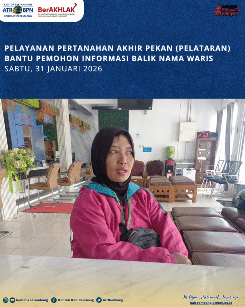 Rembang – Dalam rangka meningkatkan aksesibilitas layanan pertanahan kepada masyarakat, Kantor Pertanahan Kabupaten Rembang kembali melaksanakan Pelayanan Pertanahan Akhir Pekan (PELATARAN) pada Sabtu, 31 Januari 2026. Kegiatan ini menjadi wujud nyata komitmen dalam memberikan pelayanan prima yang mudah dijangkau oleh seluruh lapisan masyarakat.