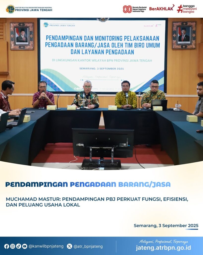 Semarang – Kanwil BPN Provinsi Jawa Tengah menggelar kegiatan Pendampingan dan Monitoring Pelaksanaan Pengadaan Barang/Jasa pada Rabu, 3 September 2025. Kegiatan yang dilaksanakan di Aula Sentosa Kanwil BPN Jateng ini berlangsung secara hybrid (luring dan daring), dengan menghadirkan pejabat terkait dari seluruh Kantor Pertanahan kabupaten/kota se-Jawa Tengah.