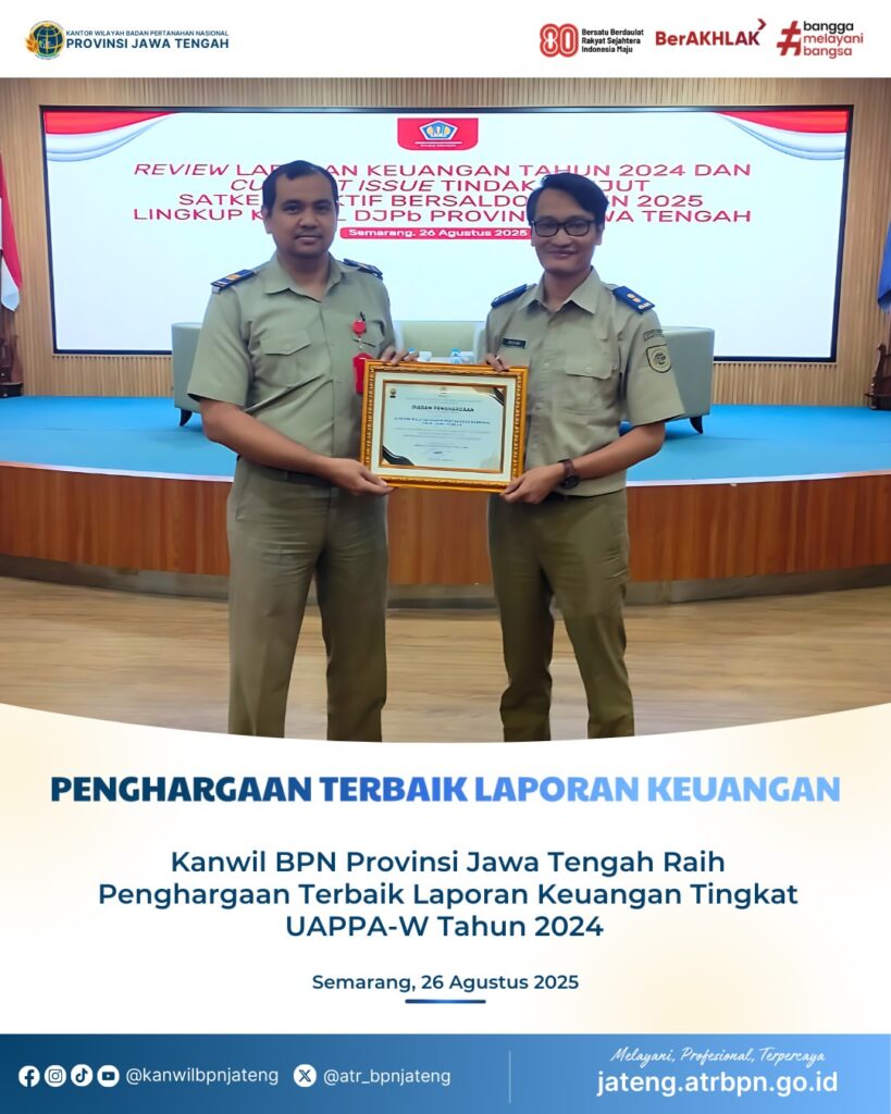 Semarang – Kanwil BPN Provinsi Jawa Tengah meraih prestasi membanggakan dalam kegiatan Review Laporan Keuangan Tahun 2024 dan Current Issue Tindak Lanjut Satker Inaktif Bersaldo Tahun 2025 yang diselenggarakan oleh Kantor Wilayah Direktorat Jenderal Perbendaharaan (DJPb) Provinsi Jawa Tengah di Aula Gedung Keuangan Negara I Semarang.