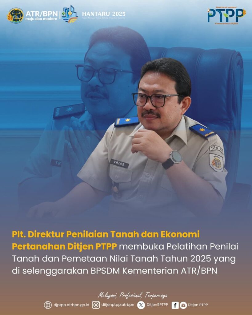 Plt. Direktur Penilaian Tanah dan Ekonomi Pertanahan Direktorat Jenderal Pengadaan Tanah dan Pengembangan Pertanahan (Ditjen PTPP) Kementerian ATR/BPN, Trias Wiriahadi membuka Pelatihan Penilaian Tanah dan Pemetaan Nilai Tanah Tahun 2025 yang diselenggarakan secara blended learning mulai tanggal 6-26 Oktober oleh BPSDM Kementerian ATR/BPN.