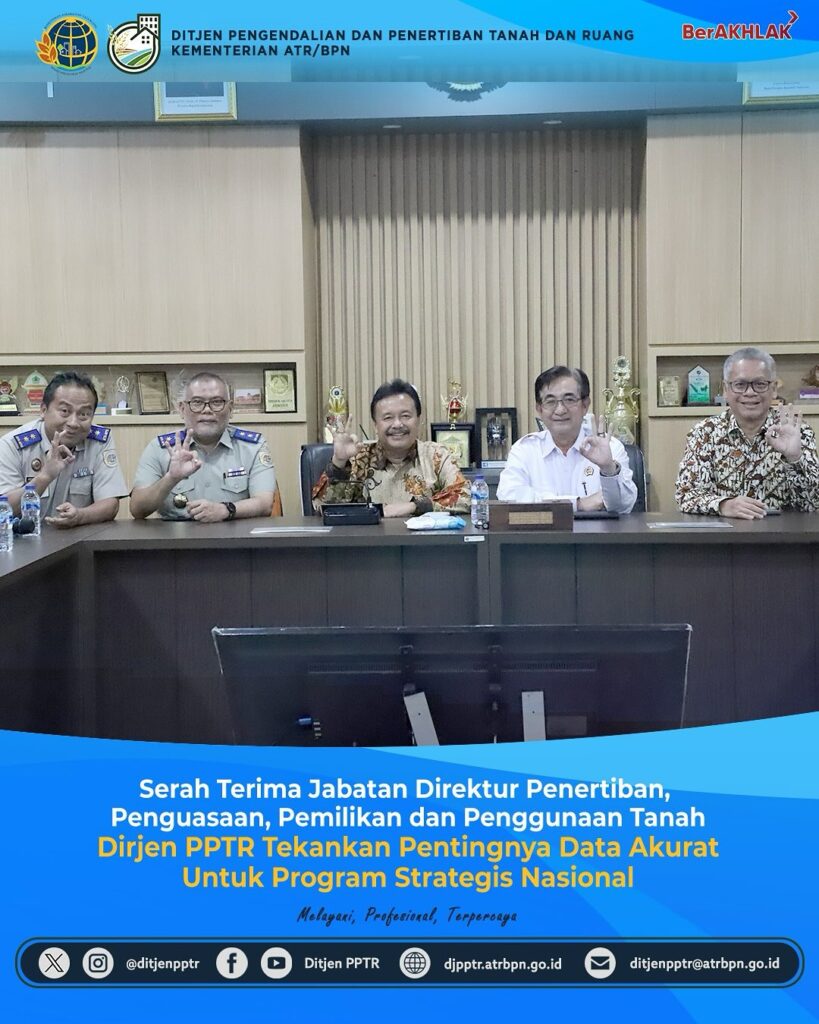 Kementerian Agraria dan Tata Ruang/Badan Pertanahan Nasional (ATR/BPN) mengadakan serah terima jabatan Pimpinan Tinggi Pratama di Lingkungan Direktorat Jenderal Pengendalian dan Penertiban Tanah dan Ruang (Ditjen PPTR) pada Senin (15/09/2025). Sepyo Achanto melakukan serah terima jabatan kepada Muhammad Shafik Ananta Inuman sebagai Direktur Penertiban Penguasaan, Pemilikan dan Penggunaan Tanah.
