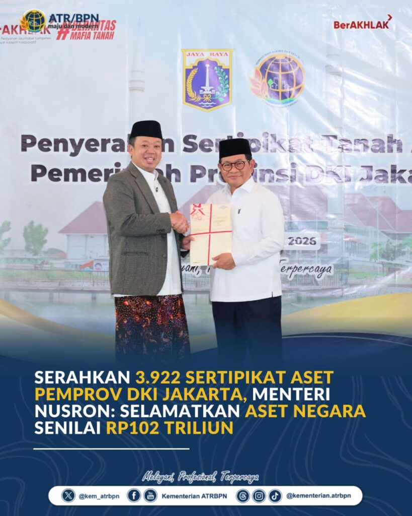 Jakarta – Menteri Agraria dan Tata Ruang/Kepala Badan Pertanahan Nasional (ATR/BPN), Nusron Wahid, menyerahkan 3.922 sertipikat hak atas tanah milik Pemerintah Provinsi DKI Jakarta kepada Gubernur DKI Jakarta, Pramono Anung, di Masjid Raya K.H. Hasyim Asy’ari, Jumat (13/02/2026). Penyerahan sertipikat sekaligus menandakan penyelamatan aset negara dengan total nilai mencapai Rp102 triliun.