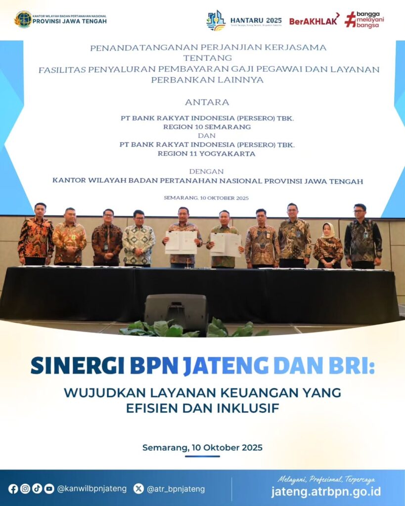 Semarang – Kantor Wilayah Badan Pertanahan Nasional (BPN) Provinsi Jawa Tengah menjalin kerja sama strategis dengan PT Bank Rakyat Indonesia (Persero) Tbk melalui BRI Regional 10 Semarang dan Regional 11 Yogyakarta. Kerja sama ini mencakup penyediaan fasilitas penyaluran pembayaran gaji pegawai serta layanan perbankan lainnya bagi seluruh jajaran pegawai BPN se-Jawa Tengah (10/10/25).