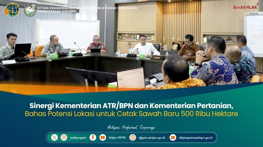 Jakarta – Direktorat Jenderal Pengendalian dan Penertiban Tanah dan Ruang (Ditjen PPTR), Kementerian Agraria dan Tata Ruang/Badan Pertanahan Nasional (ATR/BPN) menerima kunjungan dari Kementerian Pertanian dalam rangka membahas potensi lokasi untuk mendukung program cetak sawah nasional seluas 500 ribu hektare pada Jumat, (27/3/2026).