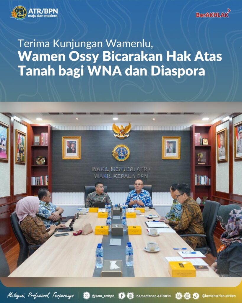 Jakarta – Wakil Menteri Agraria dan Tata Ruang/Wakil Kepala Badan Pertanahan Nasional (Wamen ATR/Wakil Kepala BPN), Ossy Dermawan, menerima kunjungan Wakil Menteri Luar Negeri (Wamenlu), Arrmanatha Christiawan Nasir, beserta jajaran di Kementerian ATR/BPN, Jakarta, Jumat (09/01/2026). Pertemuan tersebut membahas terkait pengelolaan hak atas tanah yang dimiliki warga negara asing (WNA) dan diaspora.