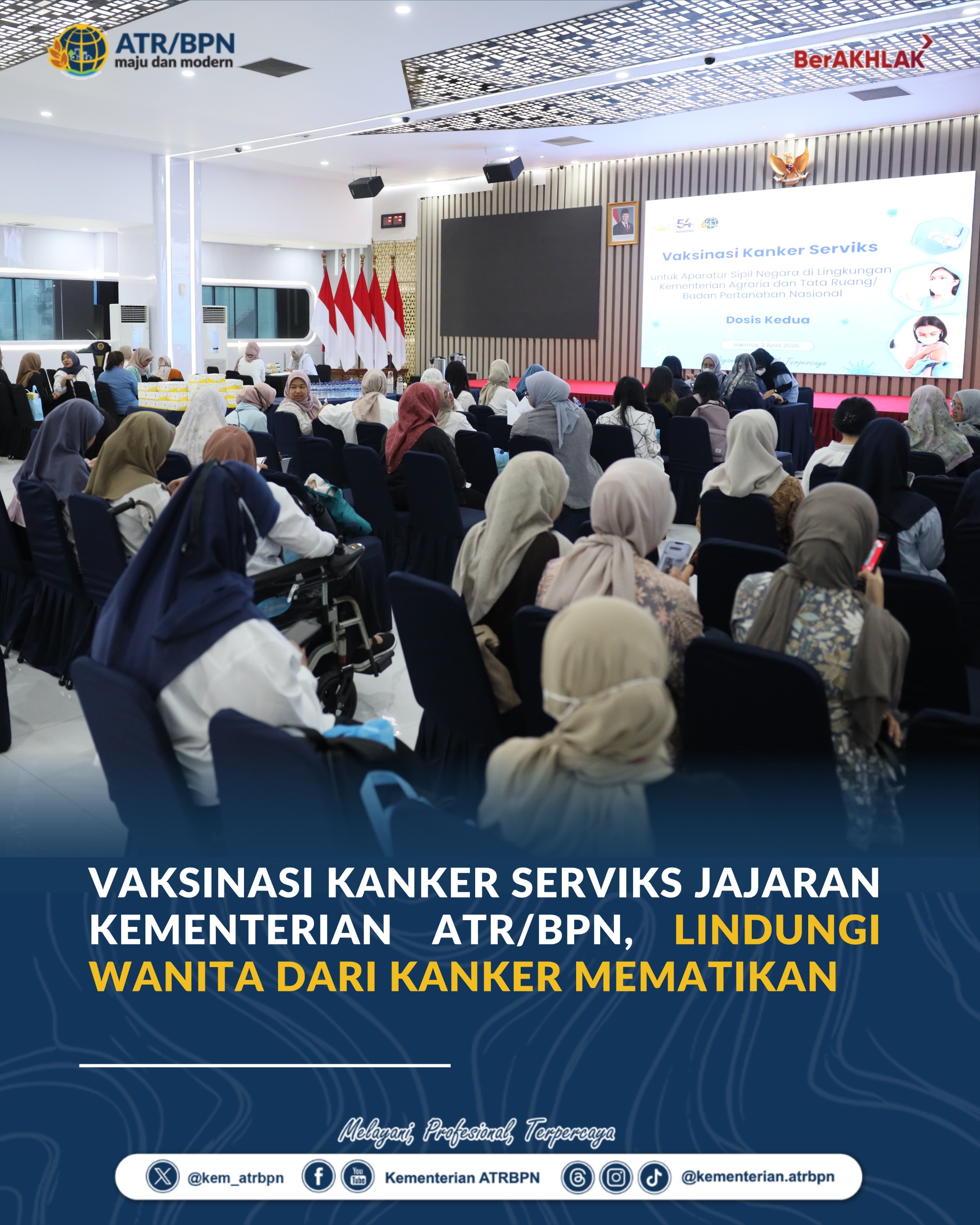 Jakarta – Kanker serviks adalah salah satu penyakit mematikan yang dapat menyerang perempuan. Untuk meningkatkan kesadaran sekaligus melindungi dari risiko terkena penyakit itu, Kementerian Agraria dan Tata Ruang/Badan Pertanahan Nasional (ATR/BPN) membuat program vaksinasi kanker serviks bagi jajarannya sejak awal 2026. Vaksinasi ini telah dinantikan oleh insan pertanahan di lingkungan Kementerian ATR/BPN.