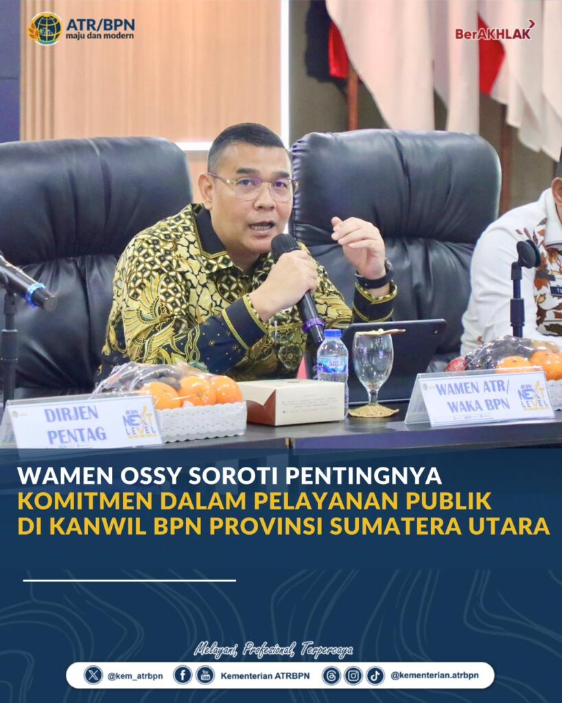 Sumatera Utara – Wakil Menteri Agraria dan Tata Ruang/Wakil Kepala Badan Pertanahan Nasional (Wamen ATR/Waka BPN), Ossy Dermawan, menekankan pentingnya peningkatan kualitas layanan pertanahan kepada masyarakat. Dalam kunjungannya ke Kantor Wilayah BPN Provinsi Sumatera Utara, Kamis (02/04/2026), Wamen Ossy mengingatkan jajaran agar menjadikan pelayanan publik ini sebagai prioritas utama.