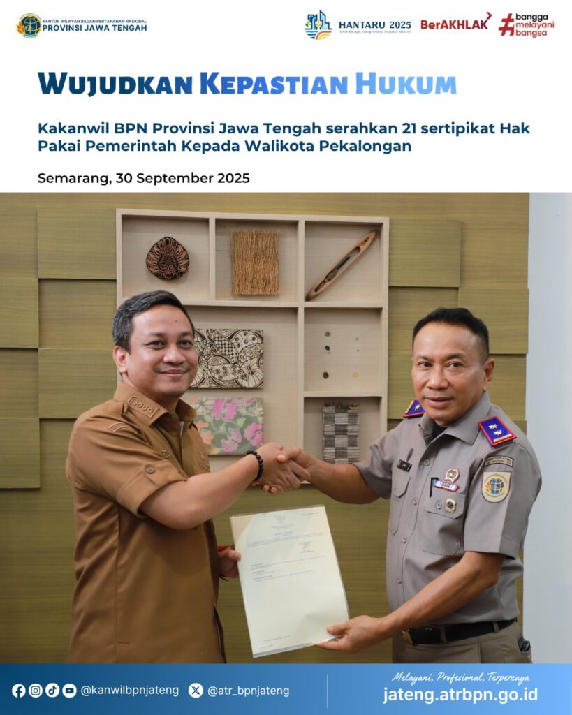 Kakanwil BPN Jateng menegaskan bahwa penyerahan sertipikat aset ini diharapkan memperkuat tata kelola aset Pemerintah Kota Pekalongan sekaligus mendukung program pembangunan daerah yang berkelanjutan.